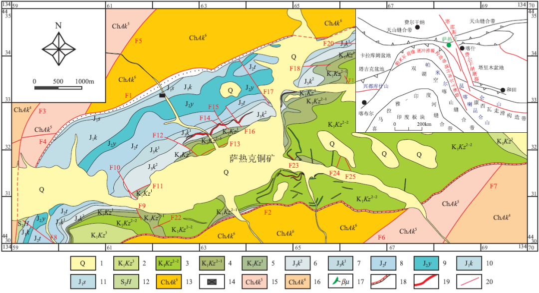 1—第四系沉積物;2—克孜勒蘇群上段;3—克孜勒蘇群中段上部;4—克孜勒蘇群中段下部;5—克孜勒蘇群下段;6—庫(kù)孜貢蘇組第二巖性段;7—庫(kù)孜貢蘇組第一巖性段;8—塔爾尕組;9—楊葉組;10—康蘇組;11—沙里塔什組;12—合同沙拉群千枚巖、硅質(zhì)板巖、大理巖化灰?guī)r;13—阿克蘇群第六巖性段云英片巖、大理巖;14—煤礦點(diǎn);15—阿克蘇群第五巖性段;16—阿克蘇群第四巖性段;17—輝綠巖脈;18—破碎帶;19—銅礦體;20—斷層及編號(hào)