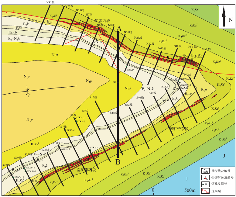 烏拉根礦區(qū)位于庫(kù)什維克復(fù)式向斜的東段,烏拉根隆起的北側(cè),受控于烏拉根向斜,該向斜的軸向近東西向,向東翹起。礦區(qū)出露地層主要為長(zhǎng)城系阿克蘇群(ChAk);下白堊統(tǒng)克孜勒蘇群(K1Kz);古近系阿爾塔什組(E1a)、齊姆根組(E1-2q)、卡拉塔爾組(E2k)、烏拉根組(E2w)、巴什布拉克組(E2-3b);漸新-中新統(tǒng)克孜洛依組(E3-N1k);中新統(tǒng)安居安組(N1a)、帕卡布拉克組(N1p)等。向斜核部為N1p,南、北翼對(duì)應(yīng)出現(xiàn)N1a、E3-N1k、E2-3b、E2w、E2k、E1-2q、E1a、K1Kz。礦區(qū)重要的斷裂為吾合沙魯斷裂,其重要的影響是它穿越烏拉根鉛鋅礦的北礦帶,所形成的破碎帶中形成較富的透鏡狀方鉛礦體。同時(shí)在烏拉根向斜的南北兩翼均存在小規(guī)模的正斷層及不同規(guī)模的節(jié)理構(gòu)造,這些小規(guī)模的正斷層、南北向及北西向和北東向具有張性性質(zhì)的節(jié)理發(fā)育區(qū)是地表乃至地下鉛鋅礦體集中分布的區(qū)域(圖2)。