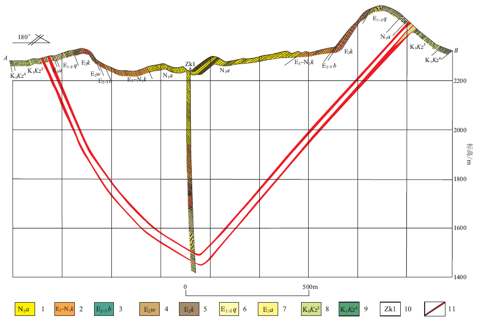 N1p—帕卡布拉克組;N1a—安居安組;E3-N1k—克孜洛依組;E2-3b—巴什布拉克組;E2w—烏拉根組;E2k2—卡拉塔爾組上段;E2k1—卡拉塔爾組下段;E1-2q—齊姆根組;E1a—阿爾塔什組;K1Kz5—克孜勒蘇群第五巖性段;K1Kz4—克孜勒蘇群第四巖性段;K1Kz3—克孜勒蘇群第三巖性段;K1Kz2—克孜勒蘇群第二巖性段;K1Kz1—克孜勒蘇群第一巖性段