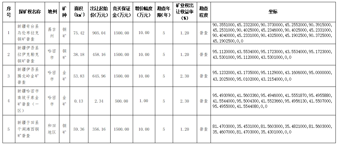 為促進(jìn)礦產(chǎn)資源勘查開(kāi)采,按照相關(guān)法律法規(guī)的規(guī)定,經(jīng)自治區(qū)人民政府批準(zhǔn),受自治區(qū)自然資源廳委托,新疆維吾爾自治區(qū)政務(wù)服務(wù)和公共資源交易中心(以下簡(jiǎn)稱(chēng)交易中心)以掛牌方式出讓新疆奇臺(tái)縣烏倫布拉克銅礦普查等8個(gè)探礦權(quán)?,F(xiàn)將有關(guān)事項(xiàng)公告如下: