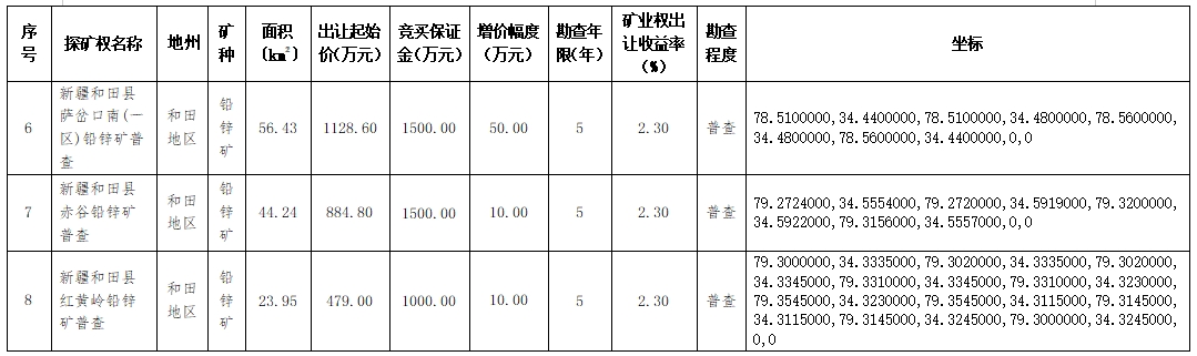 出讓探礦權(quán)名稱(chēng)、面積、拐點(diǎn)坐標(biāo)、掛牌起始價(jià)、增價(jià)幅度等基本情況(見(jiàn)附件1)。