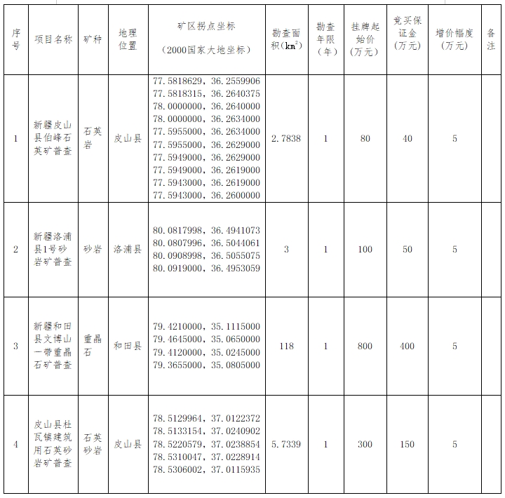 依據(jù)《中華人民共和國礦產(chǎn)資源法》《礦業(yè)權(quán)出讓交易規(guī)則》(自然資規(guī)〔2023〕1號)《新疆維吾爾自治區(qū)礦產(chǎn)資源管理若干事項暫行辦法》(新自然資規(guī)〔2021〕1號),以及《國務(wù)院辦公廳關(guān)于印發(fā)整合建立統(tǒng)一的公共資源交易平臺工作方案的通知》(國辦發(fā)〔2015〕63號)等有關(guān)法律法規(guī)和政策規(guī)定,經(jīng)和田地區(qū)資源管理委員會批準(zhǔn),新疆國源土地礦產(chǎn)資源交易中心接受委托,在和田地區(qū)行政服務(wù)和公共資源交易平臺組織以下探礦權(quán)公開掛牌出讓活動,現(xiàn)將有關(guān)事宜公告如下: