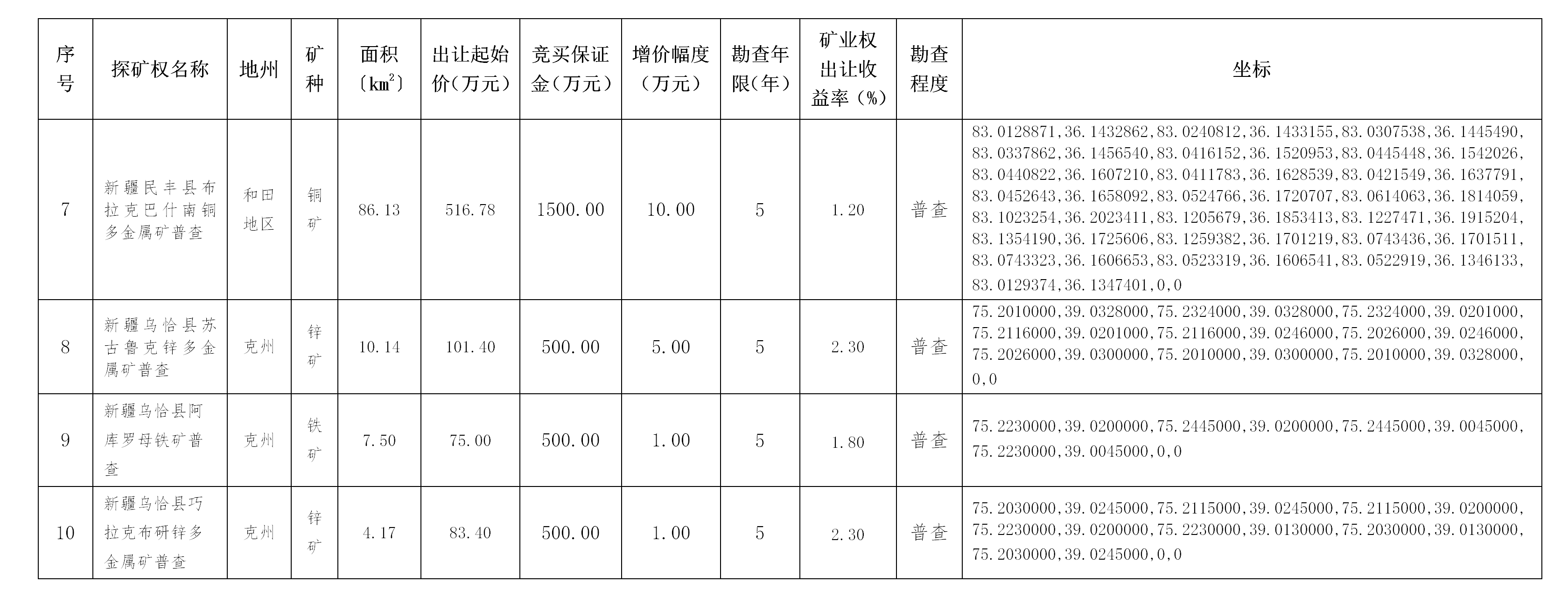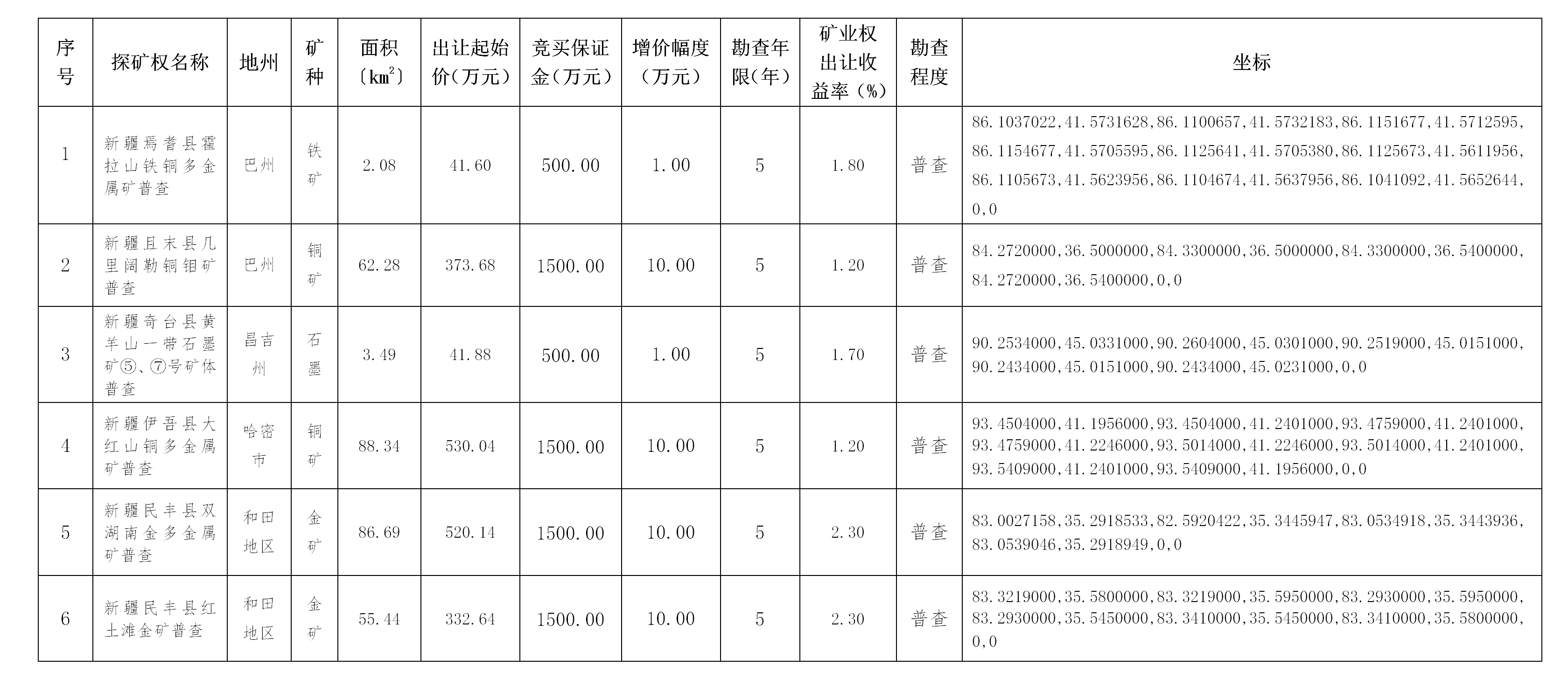 出讓探礦權(quán)名稱、面積、拐點坐標(biāo)、掛牌起始價、增價幅度等基本情況(見附件1)。