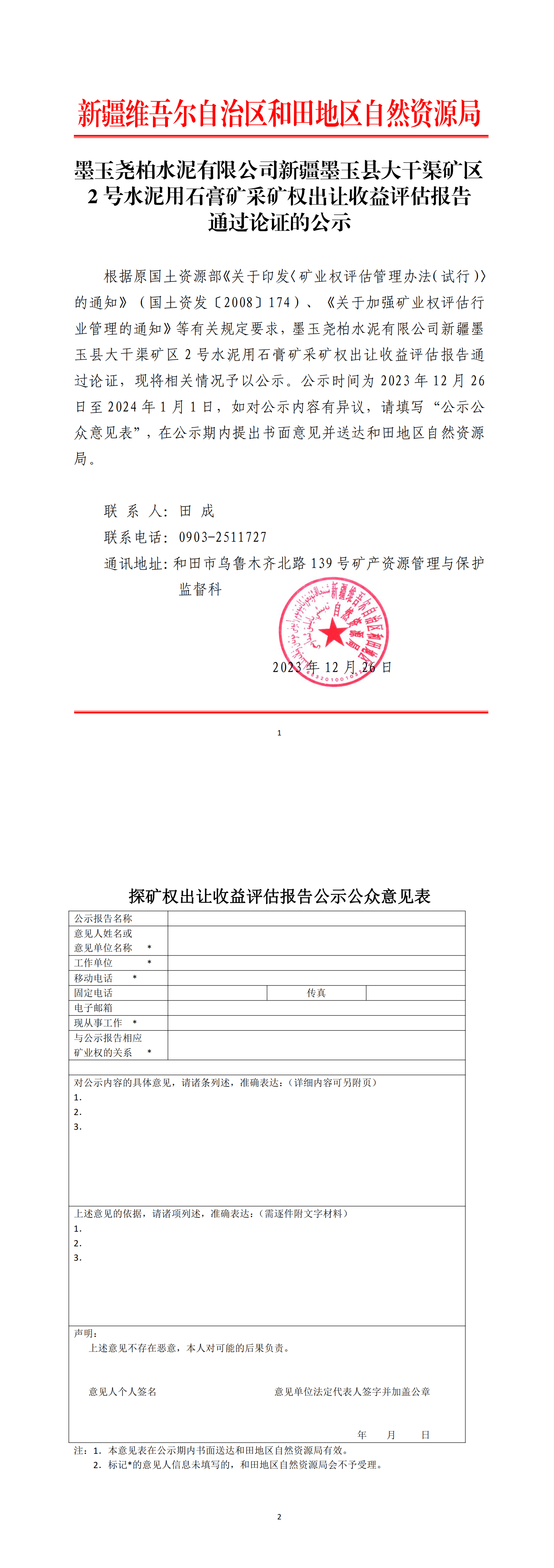 墨玉堯柏水泥有限公司新疆墨玉縣大干渠礦區(qū)2 號水泥用石膏礦采礦權出讓收益評估報告通過論證的公示