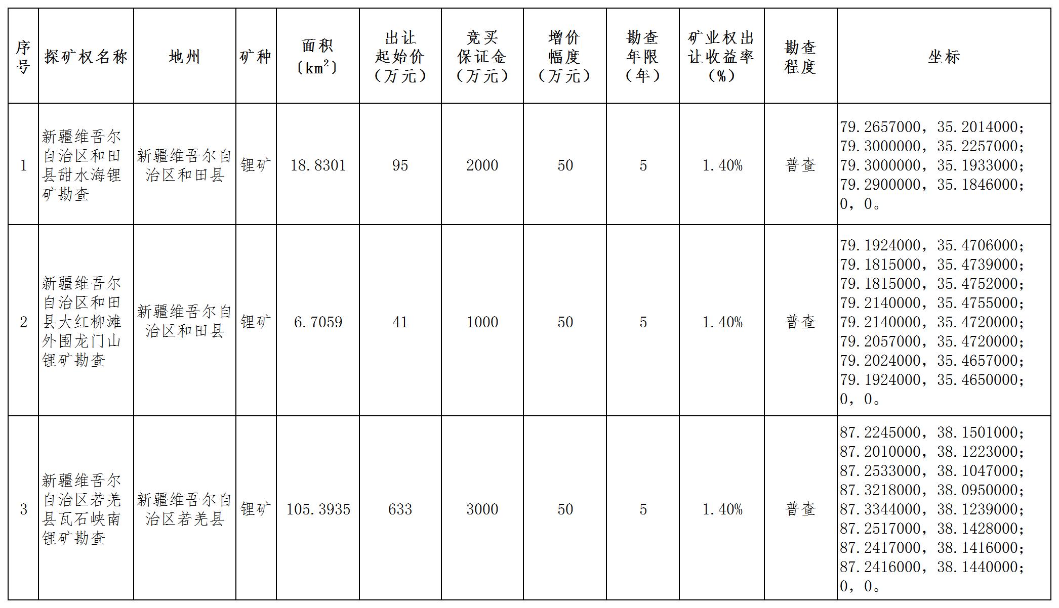 為促進(jìn)礦產(chǎn)資源勘查開(kāi)采,按照相關(guān)法律法規(guī)規(guī)定,自然資源部組織新疆維吾爾自治區(qū)自然資源廳實(shí)施新疆維吾爾自治區(qū)和田縣甜水海鋰礦勘查等3宗鋰礦探礦權(quán)掛牌出讓。