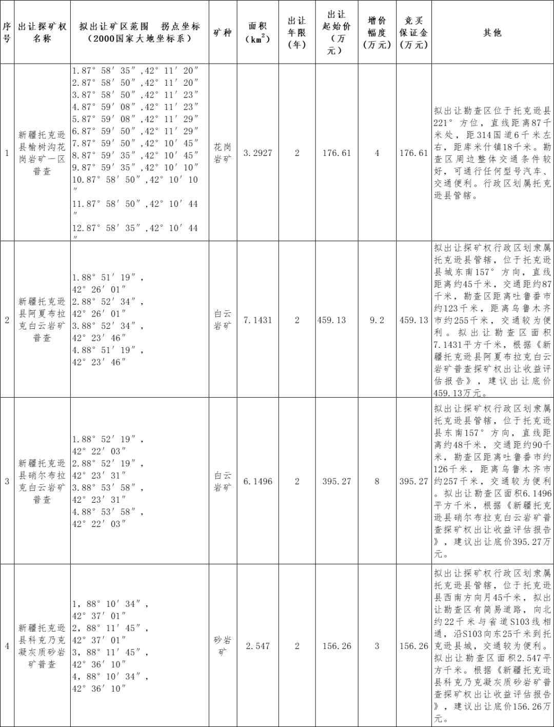 為深化礦產(chǎn)資源有償使用制度,培育和建立規(guī)范、開放、競爭、有序的礦業(yè)權(quán)市場,促進礦產(chǎn)資源有序開發(fā),根據(jù)《中華人民共和國礦產(chǎn)資源法》、《礦業(yè)權(quán)出讓交易規(guī)則》(自然資規(guī)〔2023〕1號)、《關(guān)于印發(fā)〈新疆維吾爾自治區(qū)礦產(chǎn)資源管理若干事項暫行辦法〉的通知》(新自然資規(guī)〔2021〕1號),經(jīng)吐魯番市人民政府批準,吐魯番市自然資源局委托吐魯番市建正建設(shè)工程交易有限公司(以下簡稱“建正公司”)以掛牌方式出讓新疆托克遜縣科克乃克凝灰質(zhì)砂巖礦普查等4個探礦權(quán)?,F(xiàn)將有關(guān)事項公告如下: