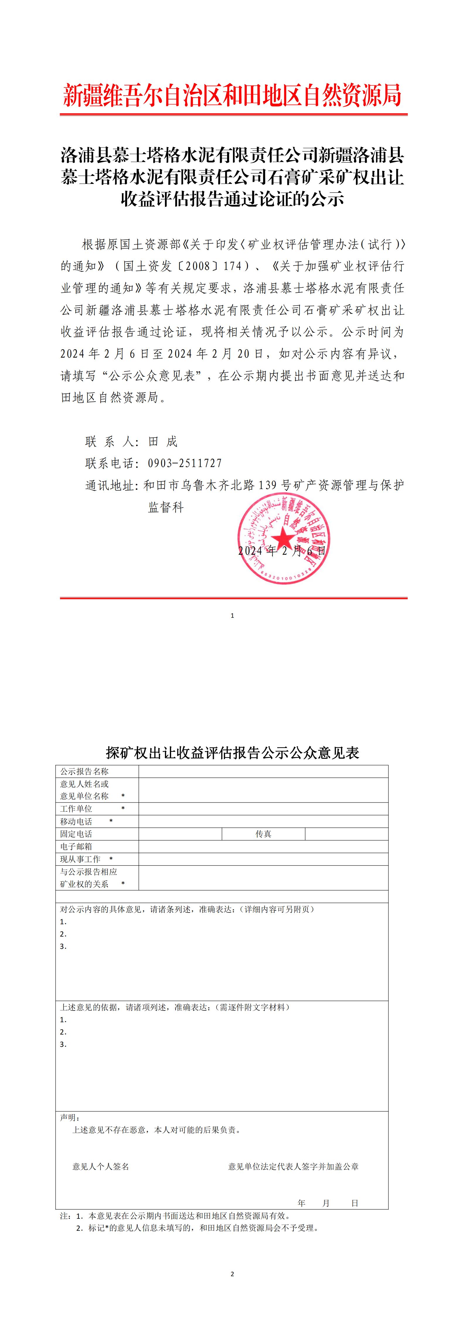 洛浦縣慕士塔格水泥有限責任公司新疆洛浦縣 慕士塔格水泥有限責任公司石膏礦采礦權(quán)出讓收益評估報告通過論證的公示