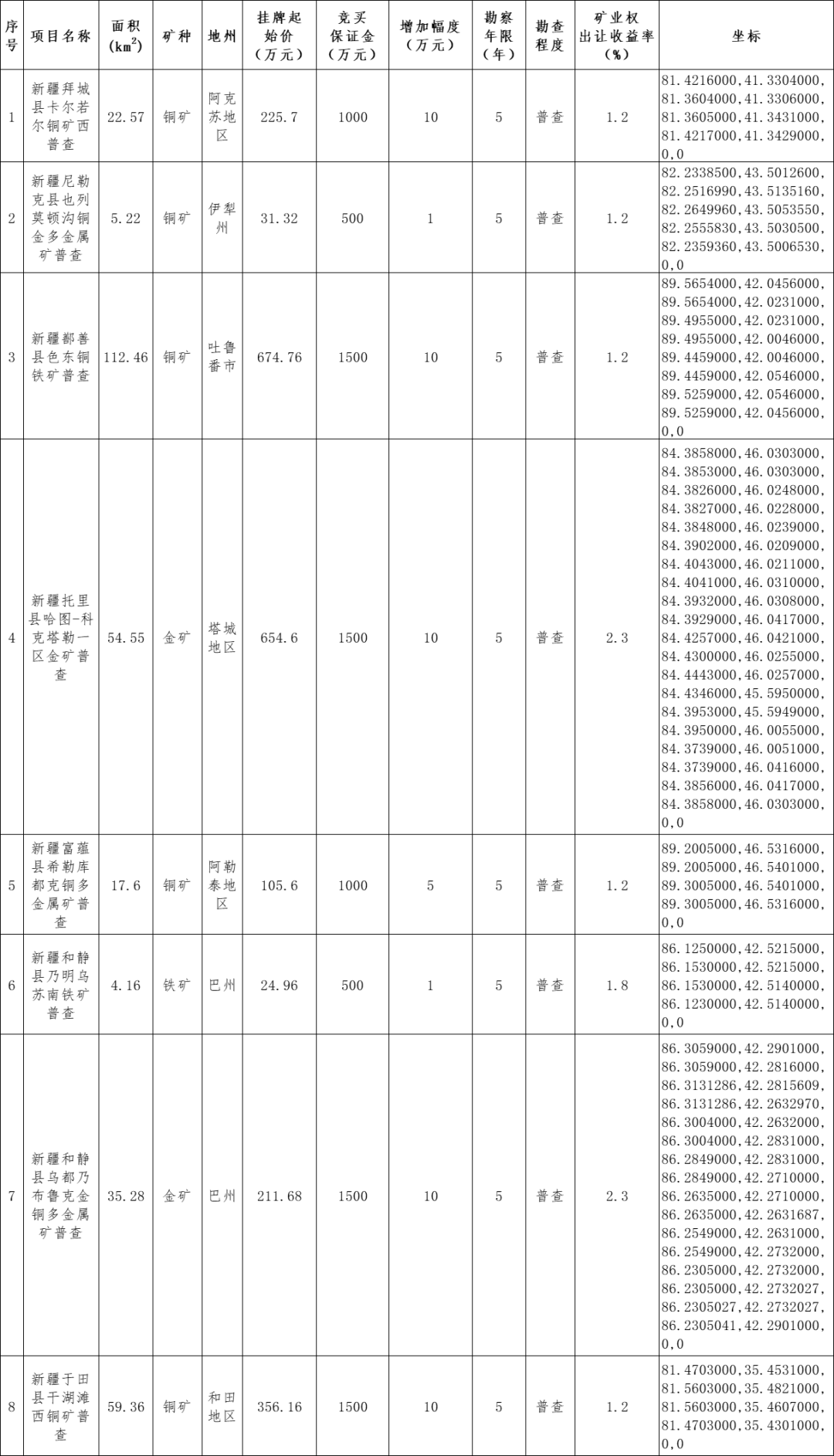 為促進(jìn)礦產(chǎn)資源勘查開(kāi)采,按照相關(guān)法律法規(guī)的規(guī)定,經(jīng)自治區(qū)人民政府批準(zhǔn),受自治區(qū)自然資源廳委托,新疆維吾爾自治區(qū)政務(wù)服務(wù)和公共資源交易中心(以下簡(jiǎn)稱(chēng)交易中心)以掛牌方式出讓新疆拜城縣卡爾若爾銅礦西普查等8個(gè)探礦權(quán)?,F(xiàn)將有關(guān)事項(xiàng)公告如下: