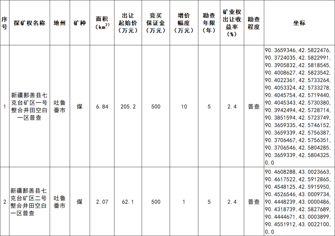 為促進礦產(chǎn)資源勘查開采,按照相關(guān)法律法規(guī)的規(guī)定,經(jīng)自治區(qū)人民政府批準,受自治區(qū)自然資源廳委托,新疆維吾爾自治區(qū)政務(wù)服務(wù)和公共資源交易中心(以下簡稱交易中心)以掛牌方式出讓新疆鄯善縣七克臺礦區(qū)一號整合井田空白一區(qū)普查等2個探礦權(quán)。現(xiàn)將有關(guān)事項公告如下: