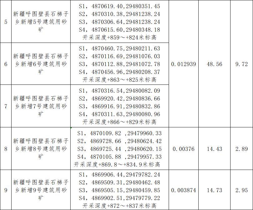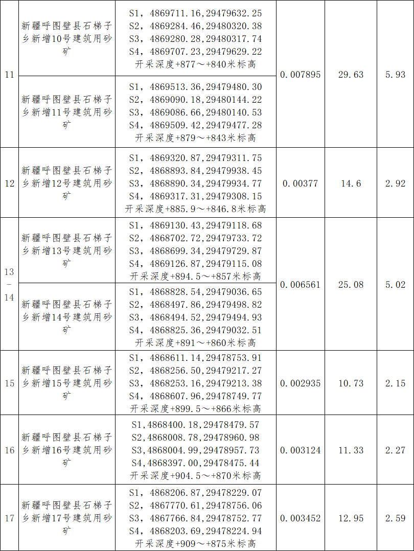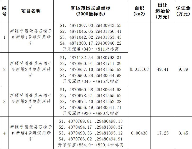 呼圖壁縣石梯子鄉(xiāng)新增1-17號(hào)建筑用砂礦空白區(qū)采礦權(quán)出讓評(píng)估報(bào)告已通過專家評(píng)審,采礦權(quán)評(píng)估值134.68萬元(按資源儲(chǔ)量合1.35元/立方米)。根據(jù)《關(guān)于石梯子鄉(xiāng)新增1-17號(hào)建筑用砂礦空白區(qū)采礦權(quán)公開掛牌出讓方案的批復(fù)》 呼縣政函【2024】7號(hào)會(huì)議決定,確定資源儲(chǔ)量掛牌出讓起始單價(jià)為2.5元/立方米,具體礦區(qū)出讓起始價(jià)見下表。