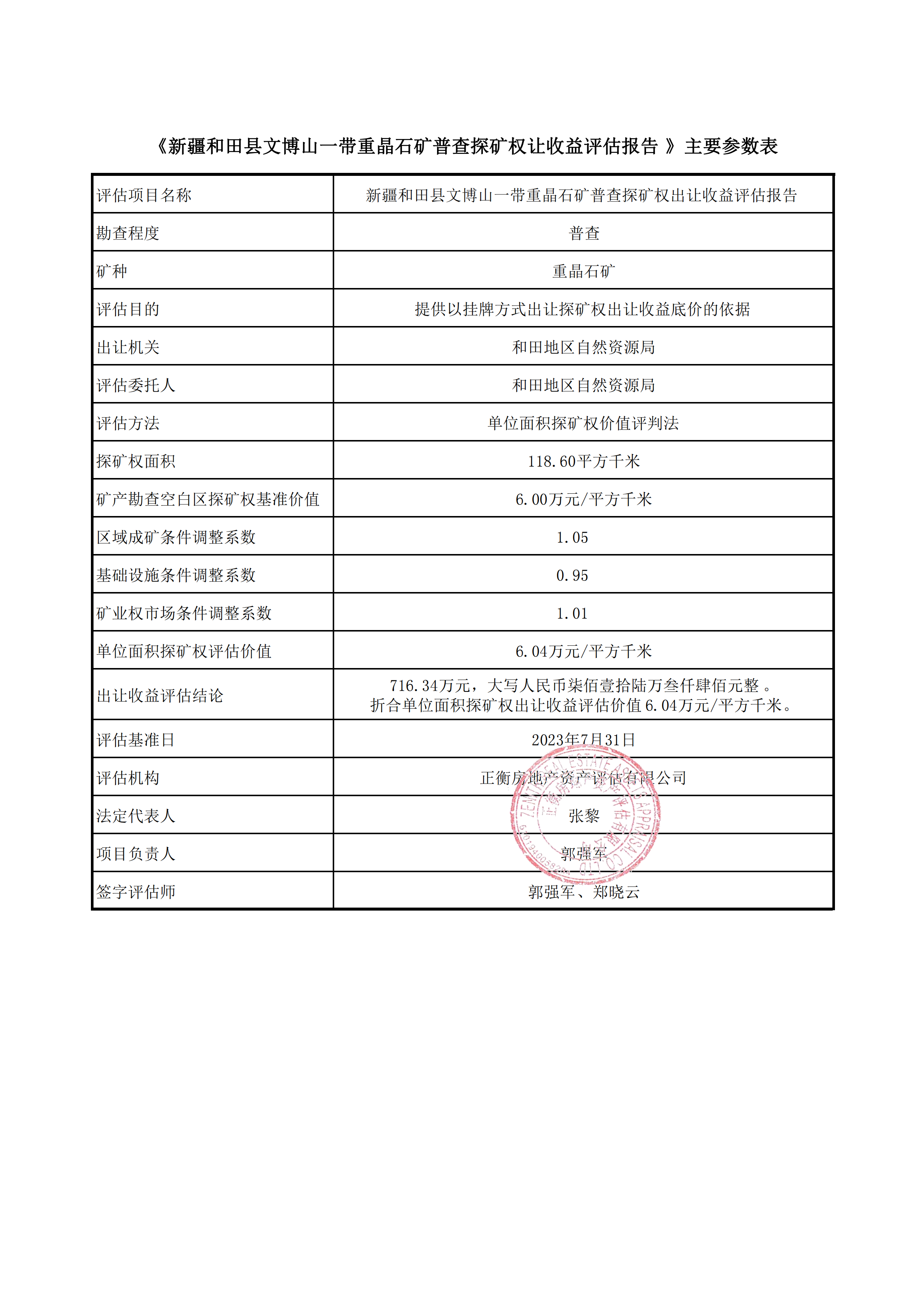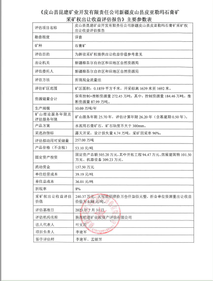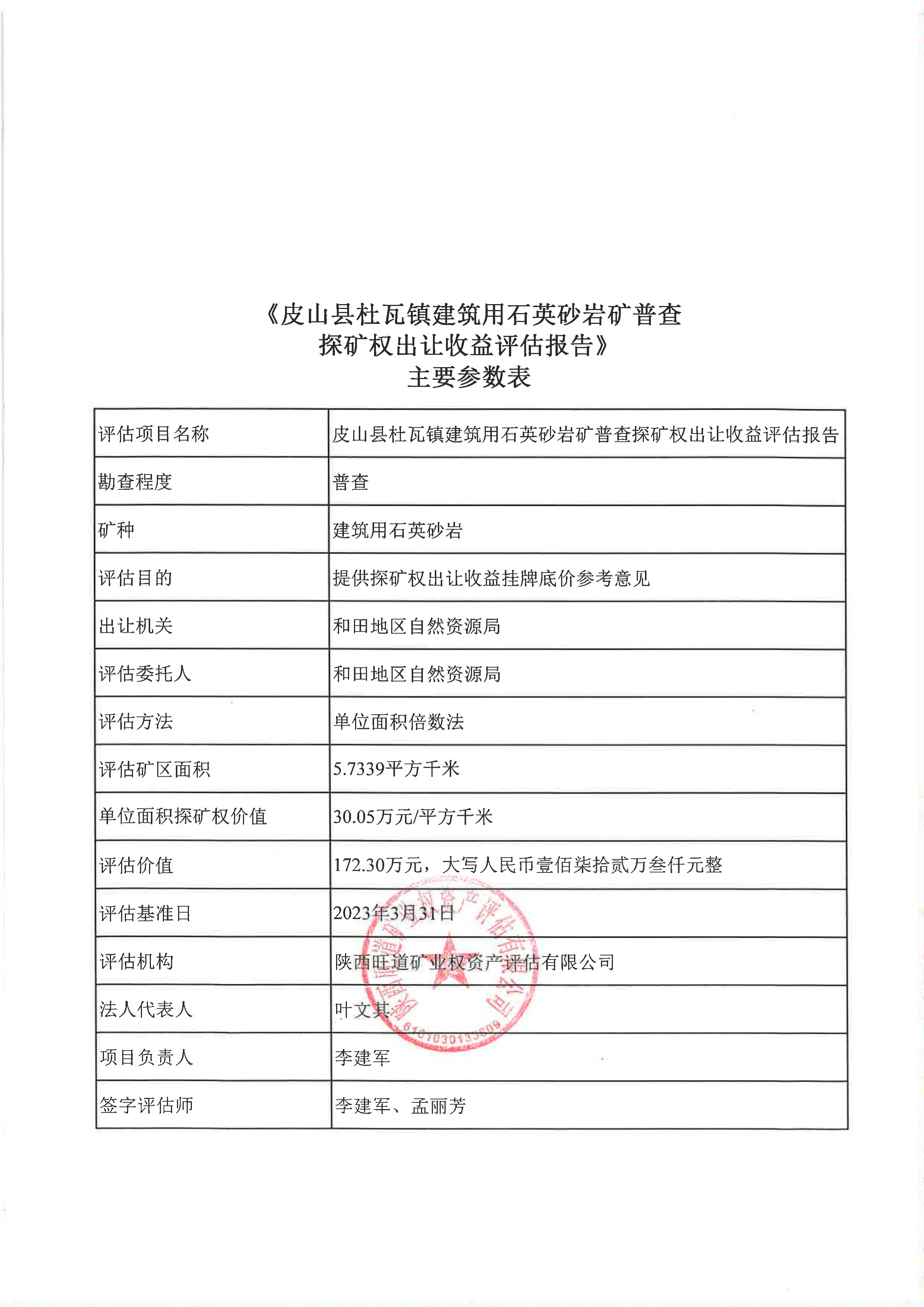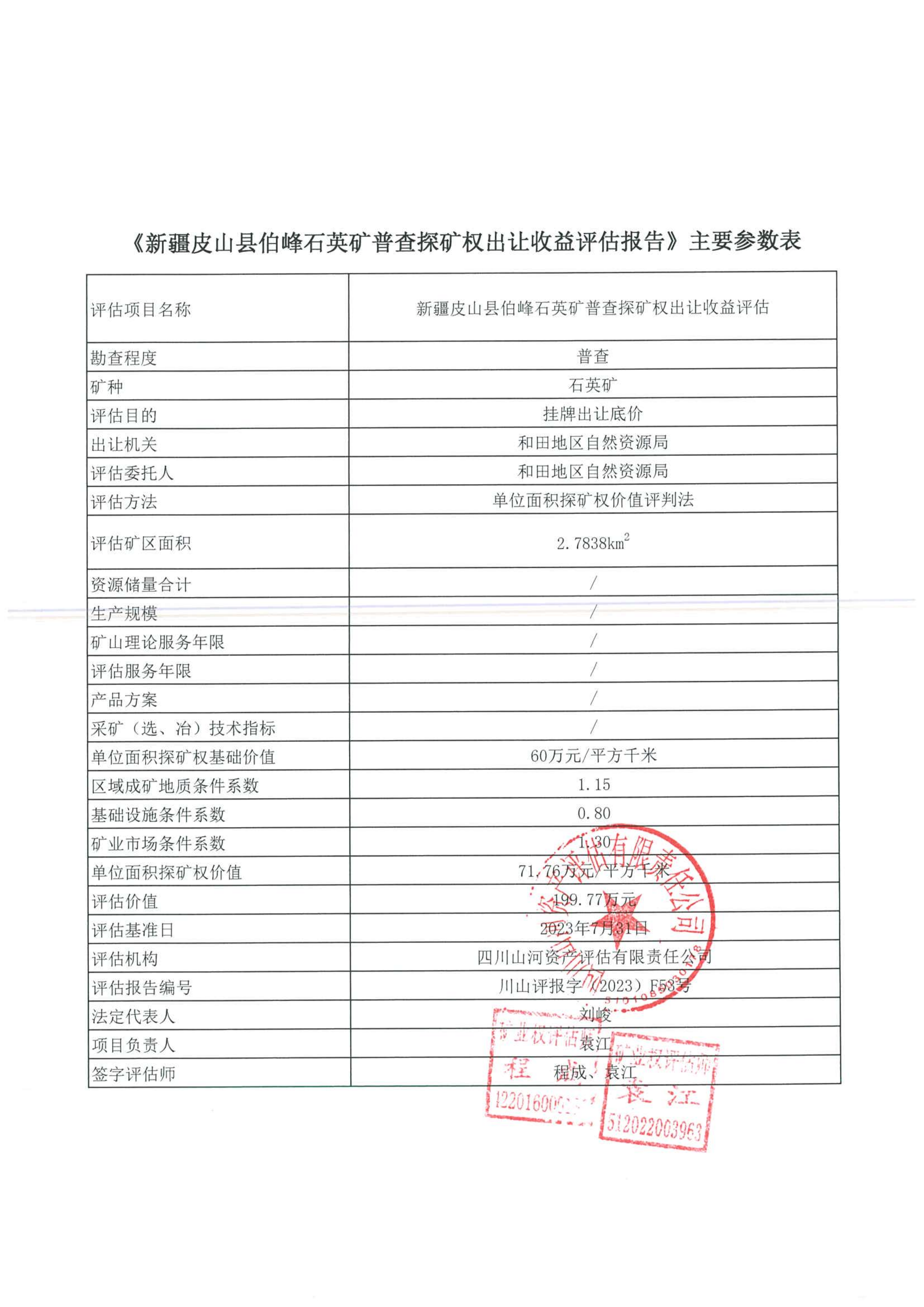 根據(jù)原國(guó)土資源部《關(guān)于印發(fā)〈礦業(yè)權(quán)評(píng)估管理辦法(試行)〉的通知》(國(guó)土資發(fā)〔2008〕174)、《關(guān)于加強(qiáng)礦業(yè)權(quán)評(píng)估行業(yè)管理的通知》等有關(guān)規(guī)定要求,新疆皮山縣伯峰石英礦普查探礦權(quán)出讓收益、新疆和田縣文博山一帶重晶石礦普查探礦權(quán)出讓收益、皮山縣皮亞勒瑪石膏礦普查采礦權(quán)出讓收益、皮山縣杜瓦鎮(zhèn)建筑用石英砂巖礦普查、新疆洛浦縣1號(hào)砂巖礦普查評(píng)估報(bào)告通過(guò)論證,現(xiàn)將相關(guān)情況予以公示。公示時(shí)間為2023年9月10日至2023年9月17日,如對(duì)公示內(nèi)容有異議,在公示期內(nèi)提出書(shū)面意見(jiàn)并送達(dá)和田地區(qū)自然資源局。