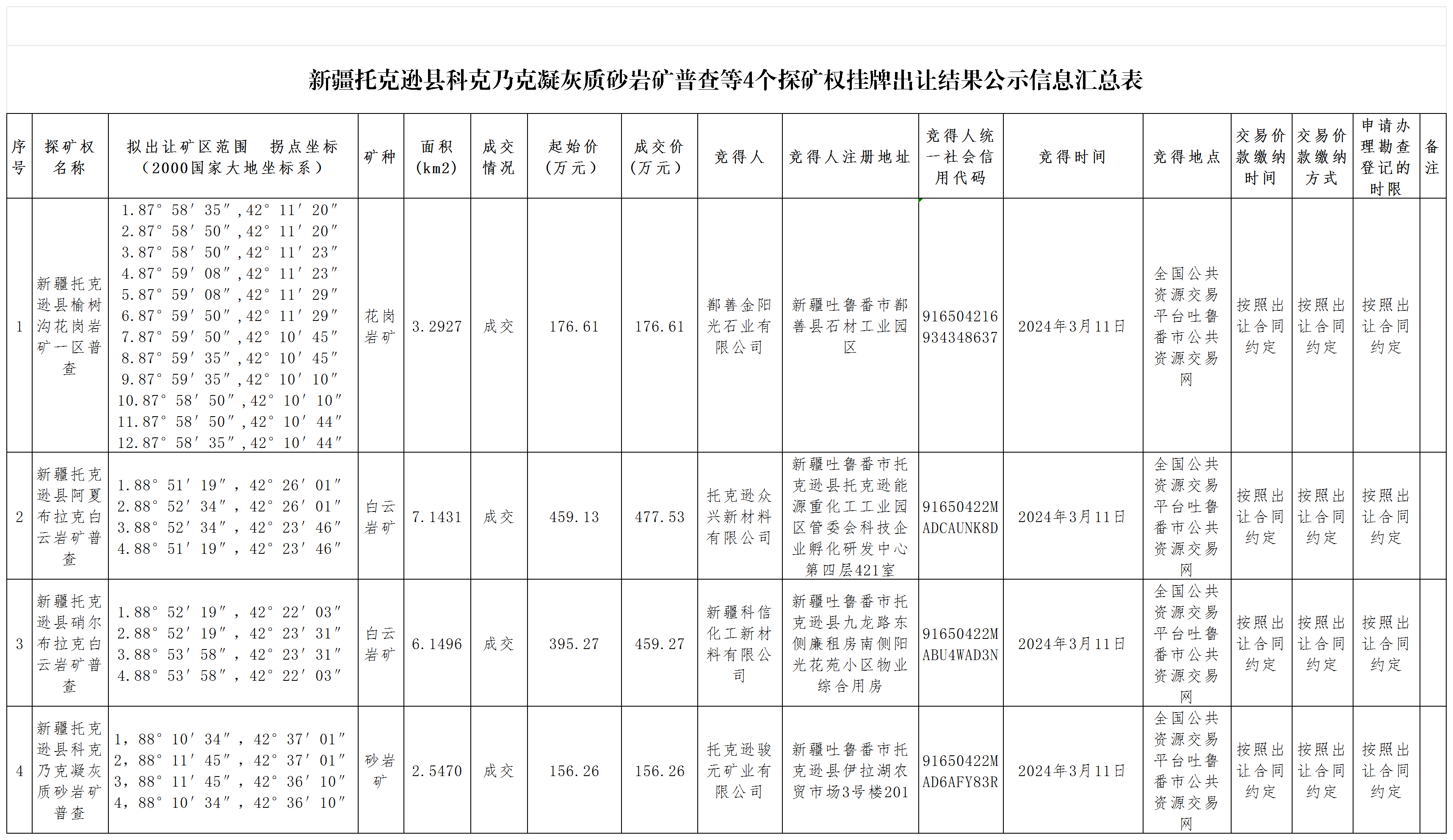 附件:新疆托克遜縣科克乃克凝灰質(zhì)砂巖礦普查等4個(gè)探礦權(quán)掛牌出讓結(jié)果公示信息匯總表
