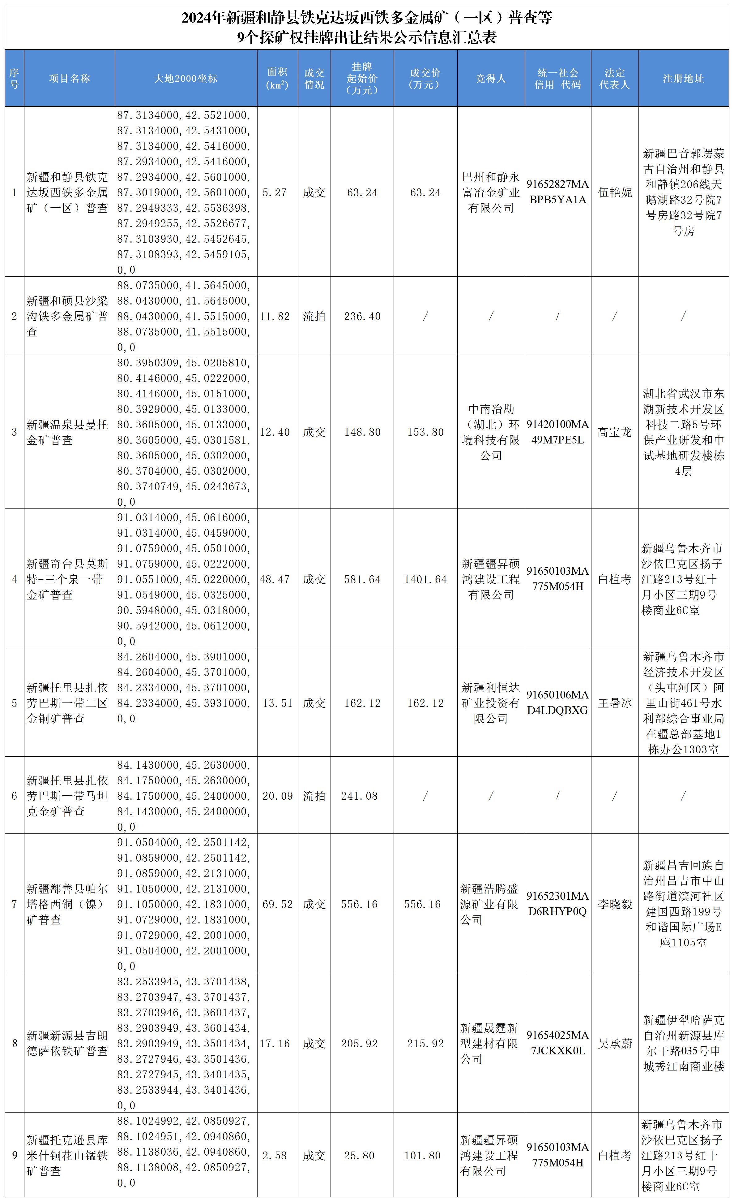 附表:2024年新疆和靜縣鐵克達(dá)坂西鐵多金屬礦(一區(qū))普查等9個(gè)探礦權(quán)掛牌出讓結(jié)果公示信息匯總表