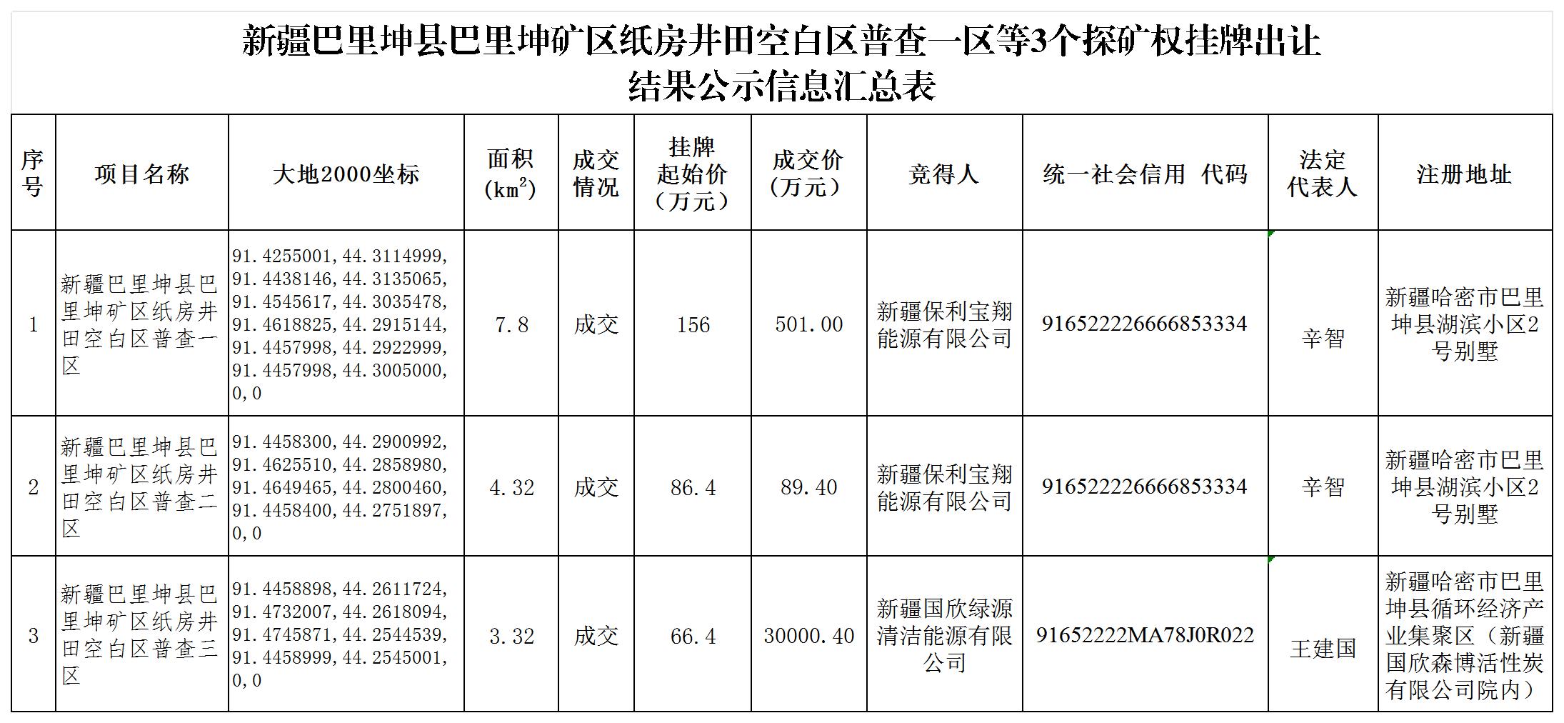 附表:新疆巴里坤縣巴里坤礦區(qū)紙房井田空白區(qū)普查一區(qū)等3個(gè)探礦權(quán)掛牌出讓結(jié)果公示信息匯總表