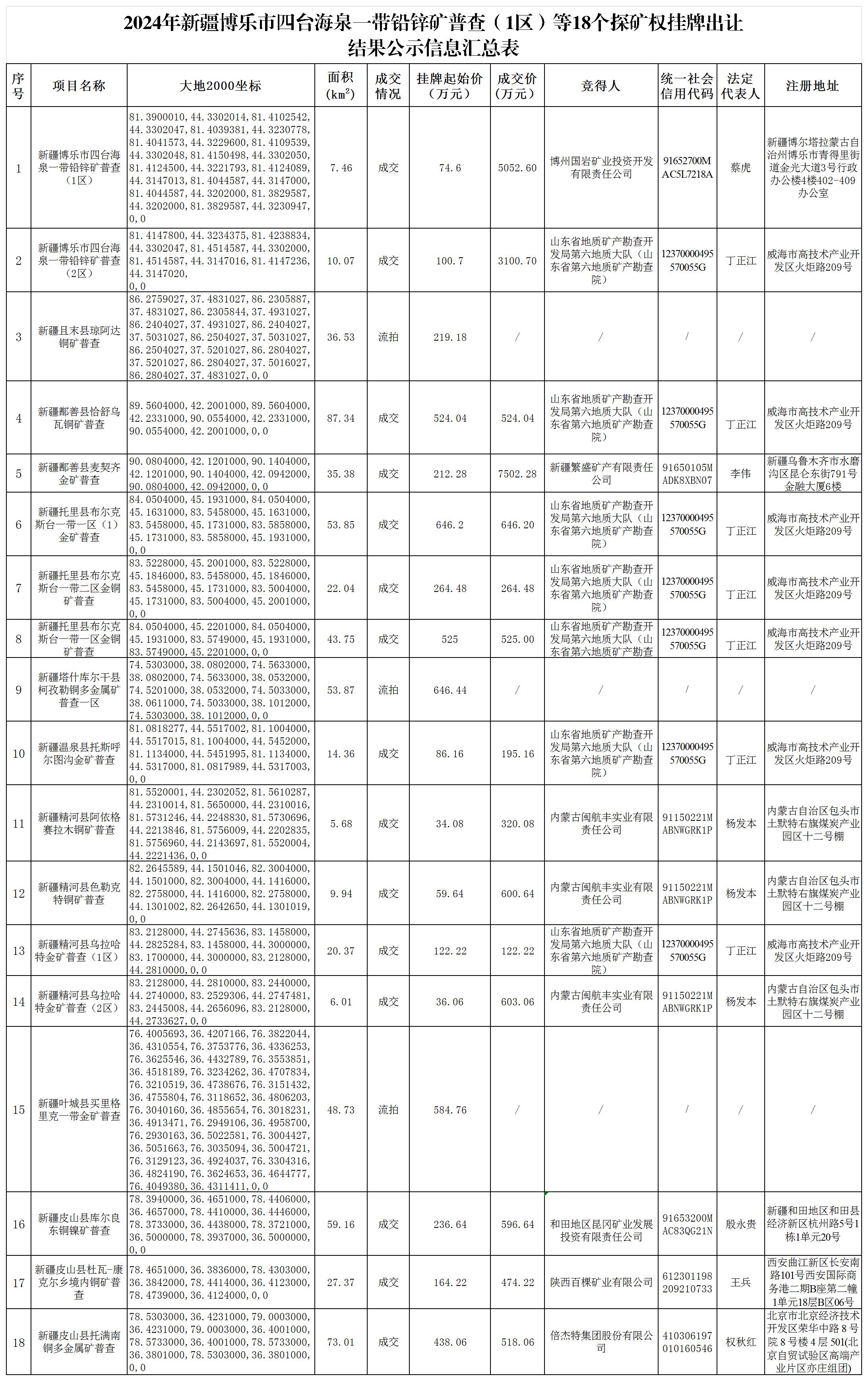 附表:2024年新疆博樂市四臺(tái)海泉一帶鉛鋅礦普查(1區(qū))等18個(gè)探礦權(quán)掛牌出讓結(jié)果公示信息匯總表