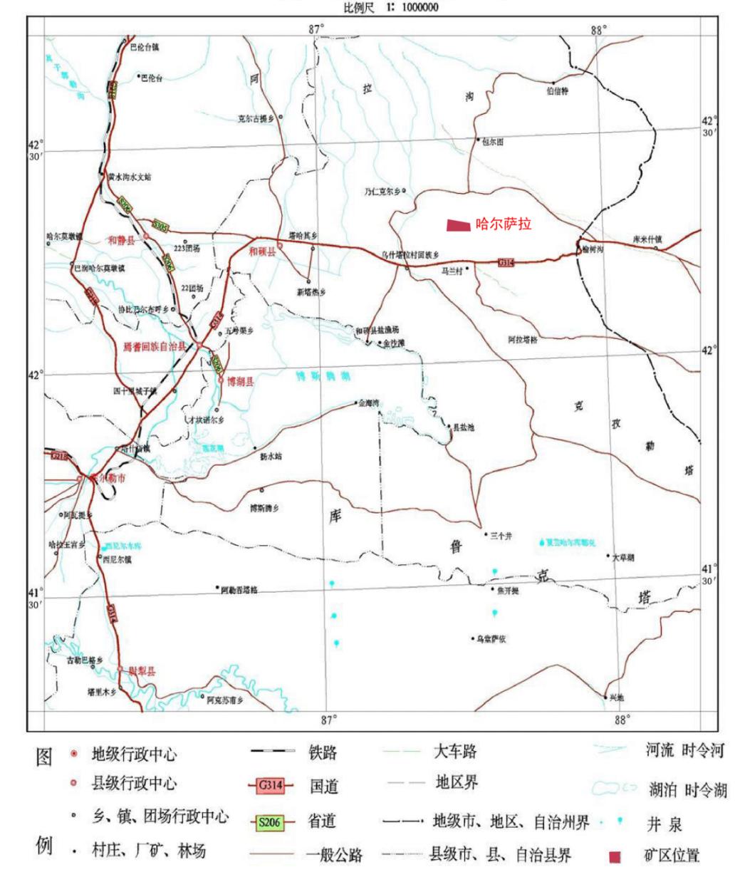 勘查區(qū)位于新疆巴音郭楞蒙古自治州和碩縣城88°方位直線距離約55千米處,距烏什塔拉鄉(xiāng)73°方位直線距離約22千米,行政區(qū)劃隸屬新疆和碩縣烏什塔拉鄉(xiāng)管轄??辈閰^(qū)距離馬蘭火車(chē)站僅15千米,距離烏什塔拉工業(yè)園38千米??辈閰^(qū)中心地理坐標(biāo)(CGCS2000坐標(biāo)系):東經(jīng)87°28′47.52″,北緯42°18′37.79″。從和碩縣烏什塔拉鄉(xiāng)G314國(guó)道岔口有簡(jiǎn)易土路可直達(dá)勘查區(qū)東部,交通較為方便。