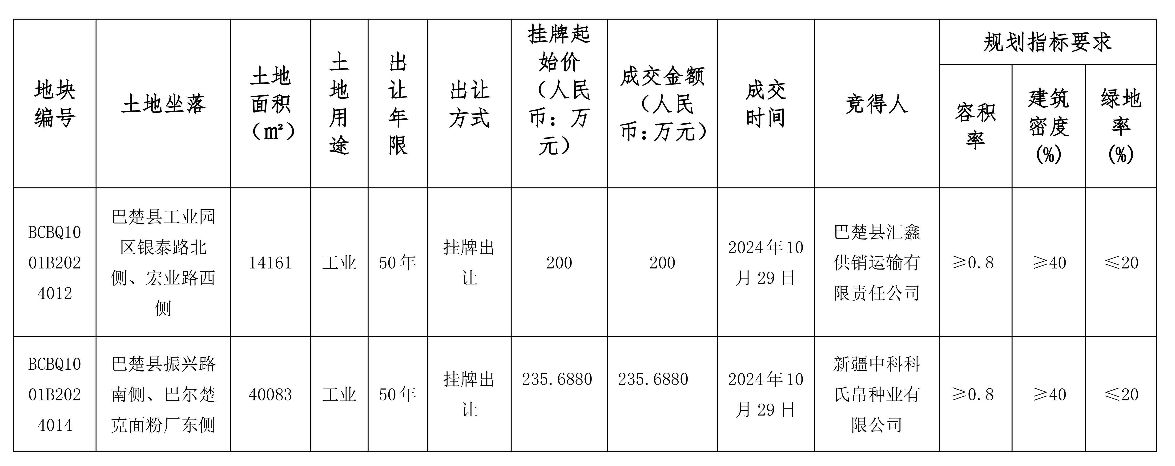 根據(jù)《中華人民共和國土地管理法》《招標(biāo)拍賣掛牌出讓國有建設(shè)用地使用權(quán)規(guī)定》(國土資源部令第39號)《自治區(qū)深化公共資源交易平臺整合共享工作方案的通知》(新政辦函〔2019〕250號)等有關(guān)法律法規(guī)及文件的規(guī)定,巴楚縣自然資源局以掛牌方式出讓2(幅)地塊的國有建設(shè)用地使用權(quán),現(xiàn)將出讓成交結(jié)果公示如下:
