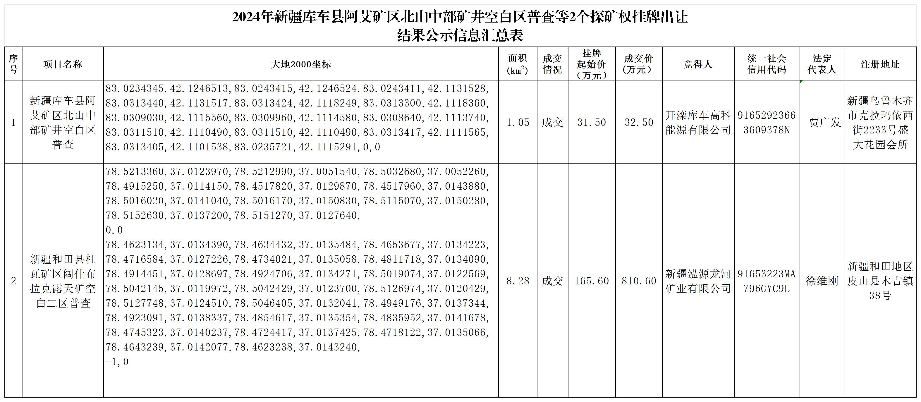 附件:新疆庫車縣阿艾礦區(qū)北山中部礦井空白區(qū)普查等2個探礦權掛牌出讓結果公示信息匯總表