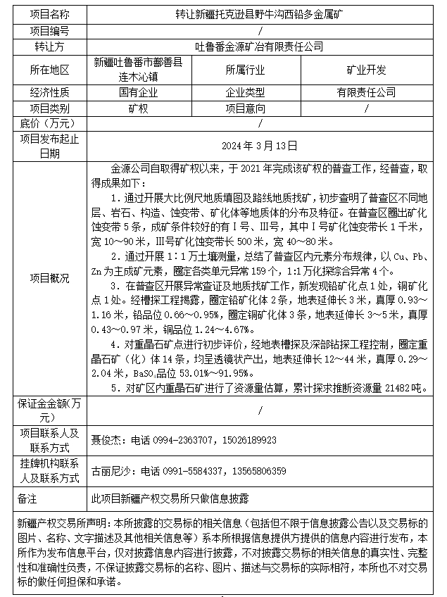 轉(zhuǎn)讓新疆托克遜縣野牛溝西鉛多金屬礦